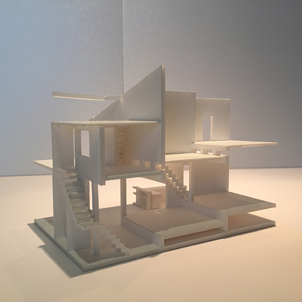 今回の計画は二世帯シェアの住空間に加えそれぞれのアトリエとワークスペースといった作業空間、ゲストが宿泊したりイベントが行える多目的なスペースとして使える用途が異なる空間を、西に弥彦山東に裏山といった外部空間をいかに取り込みながら一つの建物の中にまとめるかということがプランニングの条件だった。裏庭を取り込むグランドレベルの空間と弥彦山を邪魔無く借景できるアップフロアの空間を混在させるため、11の用途を持ったコーナーをロフトを含む9カ所のレベルを替えたスキップフロアとして構成。レベル差を利用したベンチレーションシステムを採用し冷暖房の効率も重視した。模型前面1階中央部が玄関ホール部で、その右が多目的ルーム、左から奥にむかいグランドレベルのリビングコーナー。2階右手はアトリエ、左手はワークスペース。