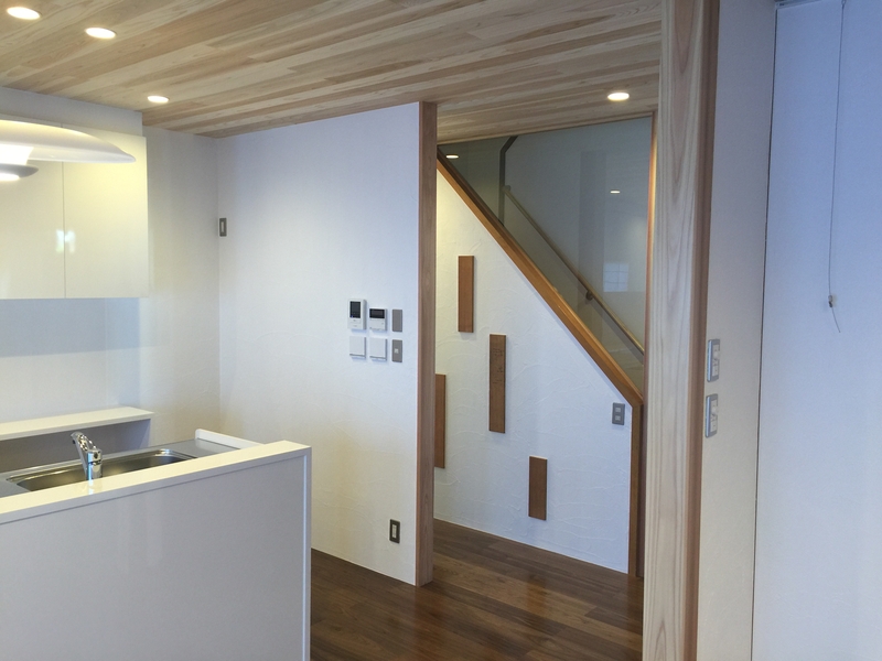 DKから水回りに続く奥廊下を望む。階段室を区画することで水回りまでは同一空間でつながる。
