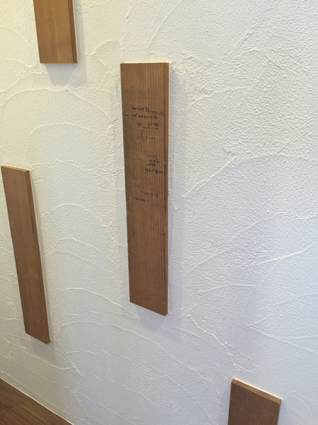 階段下にはかつて有ったお孫さんの背比べ柱をカットして埋込。実寸で取り付けているのでこれからも書き加えが可能。