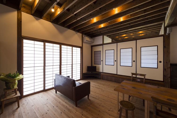居間全景 畳コーナーを仕切る。襖は古戸の再利用。又天井を張らないことで伸びやかな空間とし、かつての町屋や民家といった歴史を感じさせる住宅のエッセンスも取り入れる。