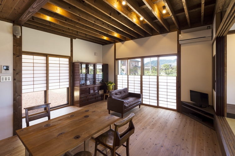 居間全景 雪見障子を部分開放。周囲には緑豊かな環境が広がっているので、その環境をプライバシーを保ちながら室内空間に取り入れられる様、外部開口部には雪見障子を採用。