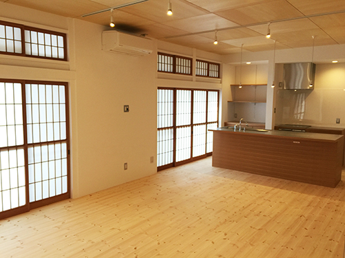 ダイニングキッチン 外部開口部は既存障子を再利用
