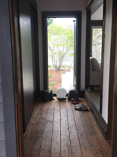 玄関ドアを開けると突き当たりの窓からシンボルツーリーの紅葉の蕪立ちが見える。これから手前も植栽し奥へと緑を続ける予定。