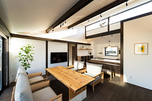 終の棲家としてコンパクトにまとめ使いやすい空間とした。天井は塗装仕上げ、壁は漆喰塗り、床は浮造りパインフローリング(床暖対応品)。